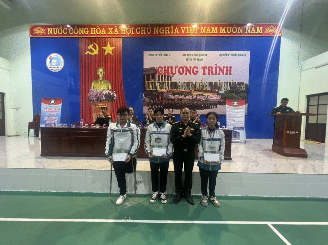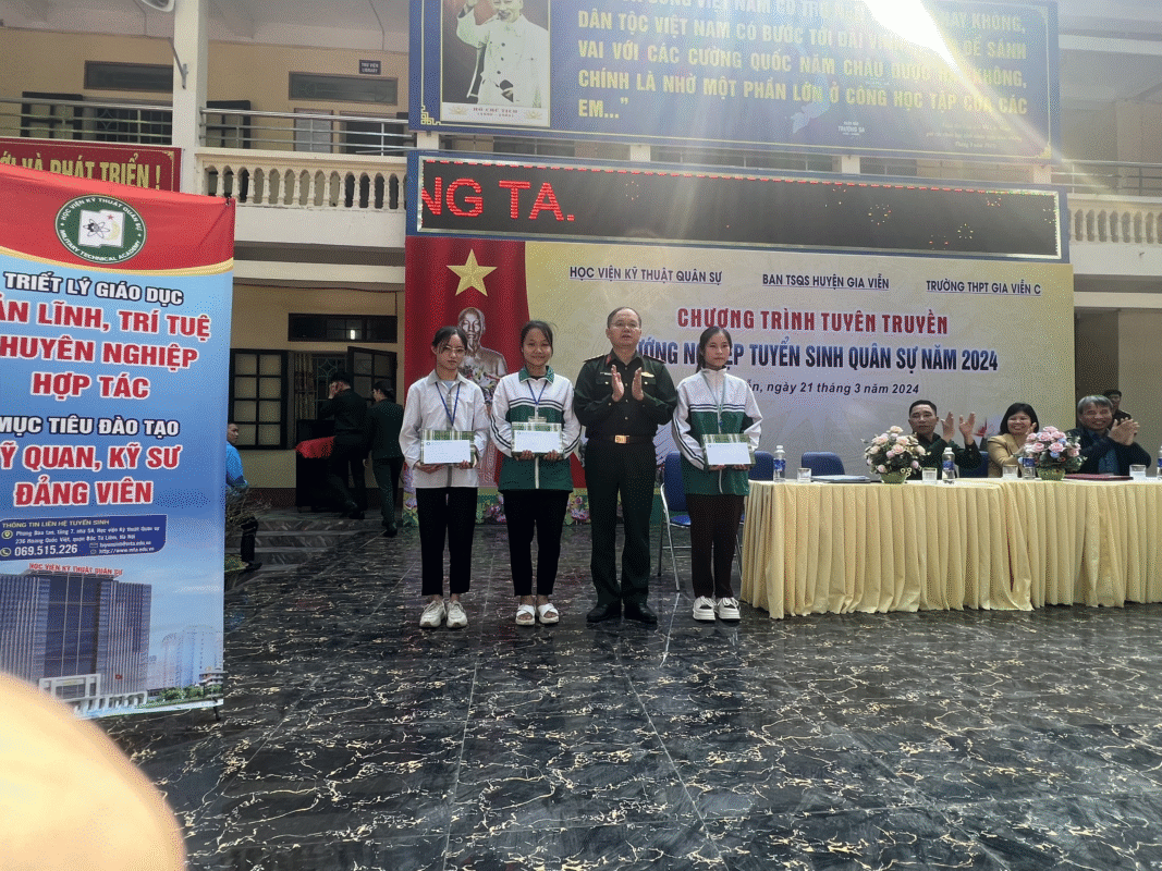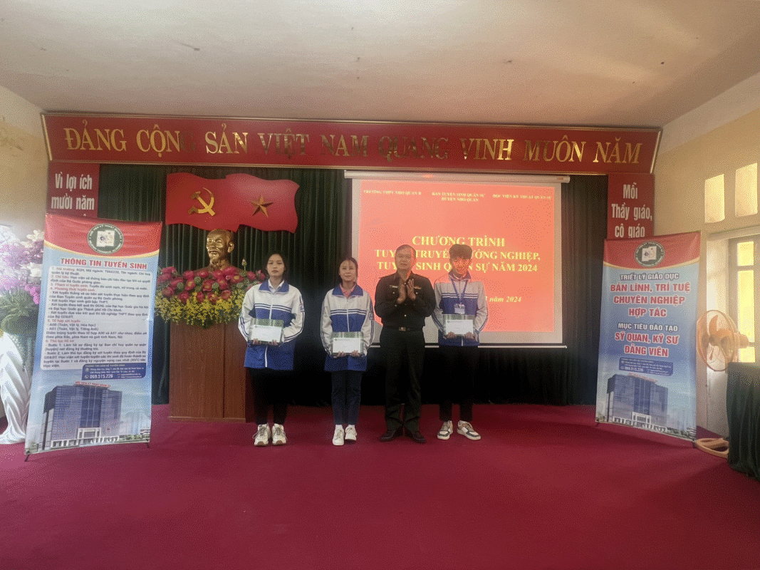 Trong chương trình hướng nghiệp, Học viện Kỹ thuật quân sự đã trao quà tặng các học sinh có hoàn cảnh khó khăn vươn lên trong học tập.
