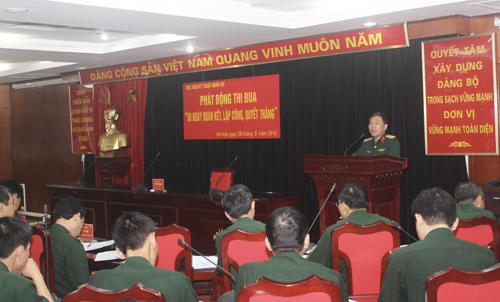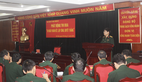 Thay mặt Đảng ủy, Ban Giám đốc Học viện, Trung tướng Trần Tấn Hùng – Bí thư Đảng ủy, Chính ủy Học viện, đã khái quát và nhấn mạnh các nội dung, chỉ tiêu, yêu cầu của đợt thi đua. Đợt thi đua gồm 03 nội dung, tập trung vào tuyên truyền, giáo dục, xây dựng ý chí, trách nhiệm, tinh thần tự giác, gương mẫu trong chấp hành kỷ luật và thực hiện nhiệm vụ; đảm bảo 100% cán bộ, giáo viên, nhân viên, học viên, sinh viên, hạ sĩ quan – chiến sĩ có nhận thức sâu sắc về truyền thống vẻ vang của Học viện, có ý chí quyết tâm và trách nhiệm cao nhất trong thực hiện nhiệm vụ; 100% cơ quan, đơn vị, cá nhân phát huy sức mạnh tổng hợp tổ chức hiệu quả các hoạt động kỷ niệm 50 năm ngày Truyền thống Học viện và Lễ kỷ niệm đảm bảo trang trọng, chu đáo, an toàn; 100% các hệ, tiểu đoàn, đại đội, lớp khóa tập trung giáo dục, quán triệt và thực hiện nghiêm túc các chỉ thị, quy định, quy chế về công tác đào tạo, NCKH; 100% các đơn vị tổ chức tuyên truyền về pháp luật Nhà nước, kỷ luật Quân đội; Chủ động nắm, quản lý tốt tình hình tư tưởng, các mối quan hệ xã hội của cán bộ, giáo viên, nhân viên, học viên, sinh viên, hạ sĩ quan – chiến sĩ, tuyệt đối không để bị động, bất ngờ.