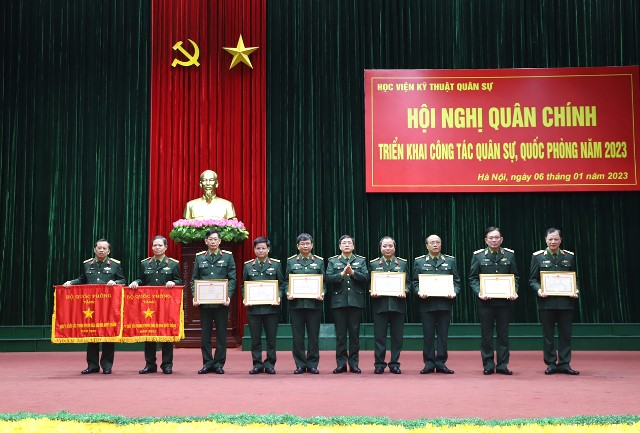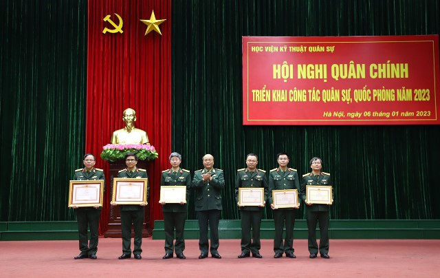 Đồng thời, Học viện đã công bố và trao Quyết định bổ nhiệm đối với các nhà giáo đạt chuẩn chức danh Giáo sư, Phó Giáo sư năm 2022. Đồng thời, được sự ủy quyền của Quân ủy Trung ương, Bộ Quốc phòng, Học viện đã công bố và tổ chức trao Cờ thi đua của BQP cho 02 tập thể; Bằng khen của Thủ tướng Chính phủ cho 02 cá nhân; Bằng khen của BQP cho 07 tập thể và 10 cá nhân đã có thành tích xuất sắc trên các mặt công tác trong năm 2022.