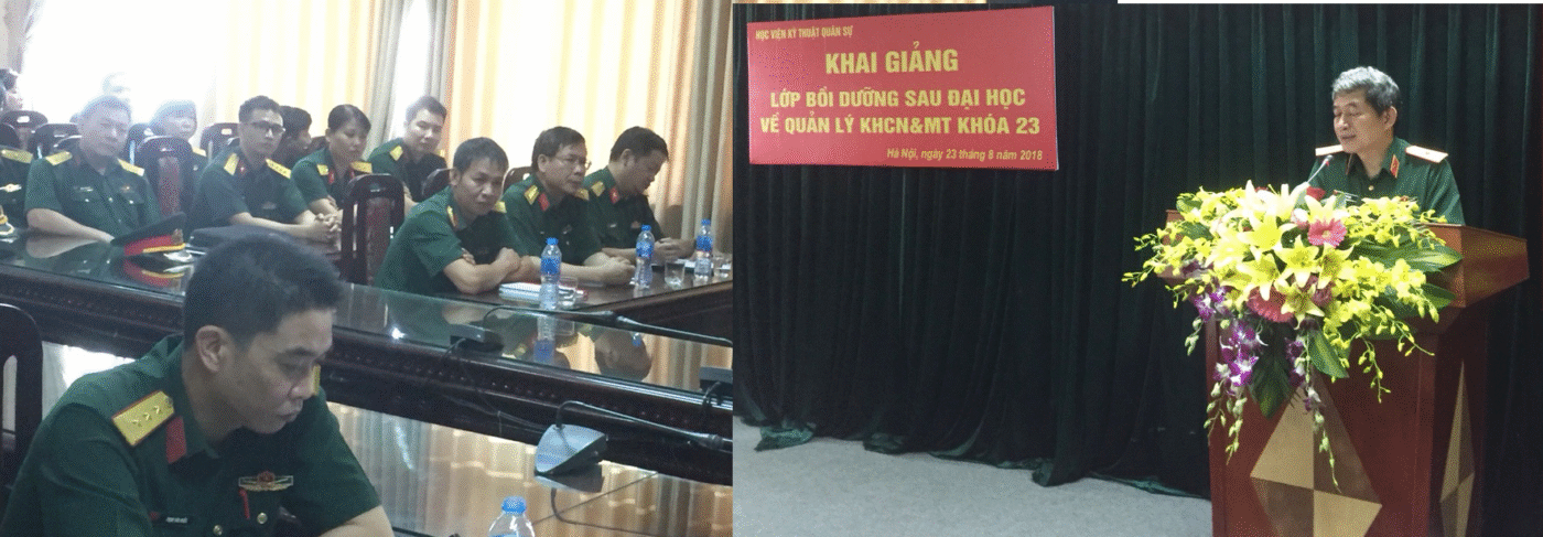 Ngày 23/8, Học viện KTQS đã tổ chức Khai giảng Lớp Bồi dưỡng Sau đại học về QLKHCN&MT Khóa 23. Tới dự và chỉ đạo Lễ khai giảng có Thiếu tướng PGS. TS Lê Kỳ Nam – Phó Giám đốc Học viện; Đại tá Thân Thành Công – Phó Cục trưởng Cục Khoa học Quân sự/BQP. Dự khai giảng còn có đại diện Phòng Tiềm lực/Cục KHQS; đại diện Phòng Chính trị, Phòng Sau đại học, Phòng Khoa học Quân sự, Khoa Cơ khí, Bộ môn QLKHCN/Khoa Cơ khí, Hệ Quản lý học viên Sau đại học (Học viện KTQS) và đông đủ 27 học viên Lớp Bồi dưỡng Sau đại học về QLKHCN&MT Khoá 23.