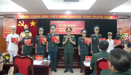 Tiếp nối buổi lễ, Đại tá Hoàng Xuân Tĩnh – Phó trưởng Phòng Đào tạo đã công bố Quyết định công nhận tốt nghiệp, Đại tá Nguyễn Minh Thắng – Chủ nhiệm Chính trị công bố Quyết định phong quân hàm, Quyết định khen thưởng đối với toàn thể học viên Chương trình Tiên tiến Việt – Nga.