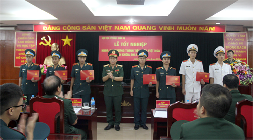 Mở đầu buổi lễ, Thượng tá Trần Văn Bình – Trưởng ban Quản lý đào tạo/Phòng Đào tạo đã thông qua bản báo cáo tổng kết toàn khóa học của học viên Chương trình Tiên tiến Việt Nga Khóa 2. Chương trình Tiên tiến Việt Nga là sản phẩm của sự hợp tác giữa Học viện KTQS và trường Đại học Bauman, Đại học Bách khoa Saint Petersburg của Liên Bang Nga. Khóa học có thời lượng 5 năm cùng tải kiến thức tương đối lớn, nhiều học phần được giảng dạy trực tiếp bằng tiếng Nga nên đòi hỏi học viên phải có trình độ tiếng Nga tốt mới tiếp thu được kiến thức trong quá trình học tập. Kết quả toàn khóa học có 27/28 học viên công nhận tốt nghiệp, trong đó có 18 học viên tốt nghiệp loại Giỏi; 21 đề tài NCKH, trong đó có 02 đề tài được tặng Bằng khen và 12 đề tài được tặng Giấy khen cấp Học viện; tham gia thi Olympic có 01 giải Nhất, 03 giải Nhì. Tỷ lệ kết nạp vào Đảng cộng sản Việt Nam đối với học viên Chương trình Tiên tiến Việt Nga đạt 96,43%.