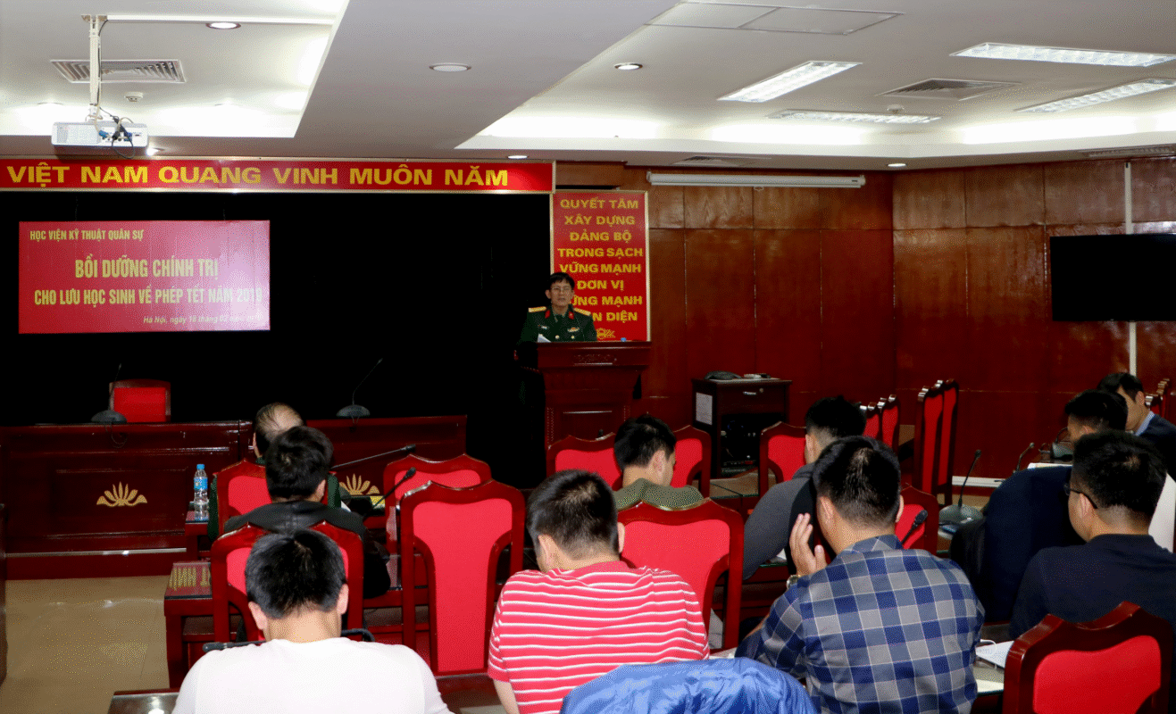 Thực hiện Kế hoạch Số 232/KH-HTQT ngày 22/01/2019 về việc tổ chức học chính trị cho lưu học sinh (LHS) về phép Tết năm 2019 được Thủ trưởng Học viện phê duyệt, ngày 18/02/2019, tại Phòng Hội thảo, nhà S4, Phòng HTQT&QLLHSQS đã tổ chức Lớp Bồi dưỡng chính trị cho 24 LHS. Tới dự và chỉ đạo lớp học có Thiếu tướng Phạm Ngọc Thắng – Phó Chính ủy Học viện, Đại tá Lê Tuấn Khanh – Phó Trưởng Phòng HTQT&QLLHSQS, đại diện Phòng Chính trị và 24 LHS về phép Tết năm 2019.