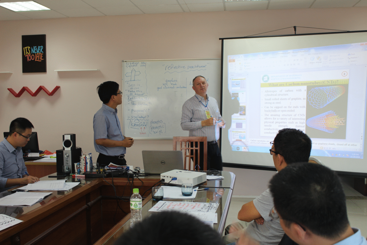 Tại Lớp ATE, các chuyên gia trình bày những nội dung chính như: Phương pháp giảng dạy và chiến thuật giảng dạy chuyên ngành bằng tiếng Anh; phân tích nhu cầu và sự tham gia học ngoại ngữ của sinh viên; thực hành giảng mẫu, phản hồi, giao tiếp trong các seminar nhỏ; xây dựng cộng đồng học tập có tính tương tác; tăng cường kỹ năng tiếng Anh. Học viên của lớp là cán bộ, giáo viên các Khoa chuyên ngành đạt trình độ tiếng Anh B2 trở lên, có khả năng giao tiếp, ứng xử và làm việc bằng tiếng Anh tốt.