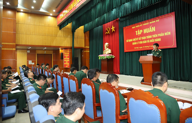 Thực hiện Kế hoạch số 2165/KH-HV ngày 09/5/2024 đã được thủ trưởng Học viện phê duyệt, sáng 14/5, Văn phòng đã tổ chức Tập huấn Sử dụng chữ ký số toàn trình trên Hệ thống Quản lý văn bản và Điều hành của Bộ Quốc phòng. Thiếu tướng Lê Anh Tuấn – Phó Giám đốc Học viện đến dự và chỉ đạo buổi Tập huấn. Tham dự Lớp Tập huấn có các đồng chí là chỉ huy trưởng, trợ lý và văn thư các cơ quan, đơn vị trong toàn Học viện.