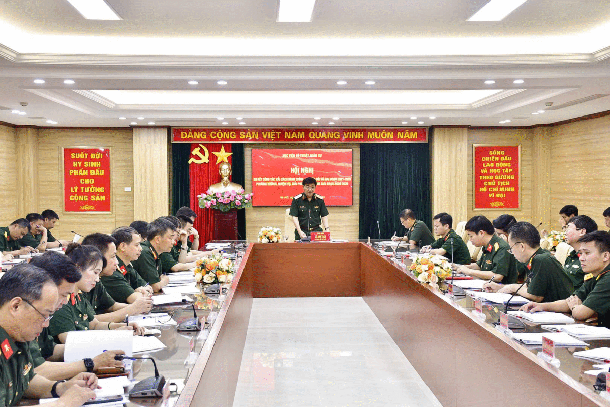 Ngày 16/5/2025, Học viện KTQS tổ chức Hội nghị sơ kết công tác cải cách hành chính (CCHC), chuyển đổi số (CĐS) giai đoạn 2021 – 2025, phương hướng, nhiệm vụ, giải pháp trọng tâm CCHC, CĐS giai đoạn 2026 – 2030 tại Học viện. Tham dự Hội nghị có các đồng chí trong Đảng ủy, Ban Giám đốc Học viện; đại diện chỉ huy các đơn vị đầu mối trực thuộc Học viện; các đồng chí Trưởng ban: Tuyên huấn, Cán bộ/ Phòng Chính trị; Công nghệ thông tin, Quân lực, Tổng hợp – Kế hoạch, Văn thư lưu trữ/ Văn phòng. Thiếu tướng Lê Anh Tuấn – Phó Giám đốc Học viện chủ trì Hội nghị.