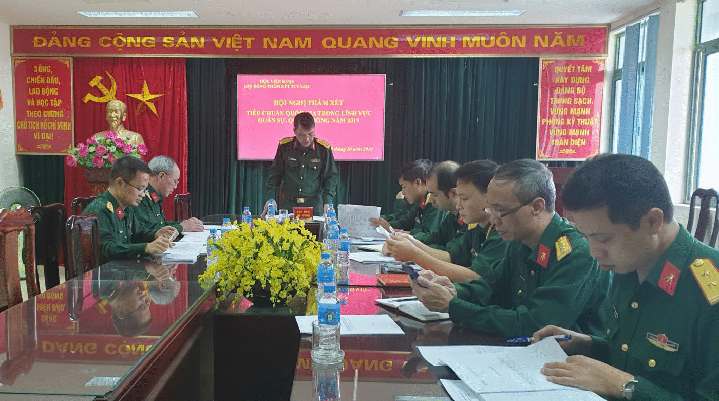 Ngày 18/10/2019, Học viện đã tổ chức Hội nghị thẩm xét đối với tiêu chuẩn quốc gia trong lĩnh vực quân sự quốc phòng: “TCVN/QS 2090 : 2019 – Khí tài quang học. Khái niệm, các thông số và đặc tính cơ bản. Thuật ngữ và định nghĩa”. Đại tá Nguyễn Văn Công – Trưởng phòng Kỹ thuật, Chủ tịch Hội đồng thẩm xét tiêu chuẩn quốc gia trong lĩnh vực quân sự, quốc phòng chủ trì Hội nghị. Tham gia Hội nghị còn có các Ủy viên Hội đồng: Đại tá Nguyễn Duy Hưng – Văn phòng/Học viện KTQS; Thượng tá Nguyễn Thu Cầm – Viện KHCNQS; Trung tá Vũ Xuân Đức – Phòng Kỹ thuật/Học viện KTQS; Trung tá Nguyễn Văn Luyến – Viện Vũ khí/Tổng cục CNQP; Thiếu tá Đặng Văn Tăng – Nhà máy Z199/ Tổng cục CNQP; Đại úy Lê Khắc Hiếu – Cục TC-ĐL-CL; Trung tá CN Nguyễn Thị Thu Thủy – Phòng Kỹ thuật/Học viện KTQS.