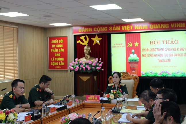 Phát biểu khai mạc, Thiếu tướng Phùng Thị Phú nhấn mạnh tầm quan trọng của việc xây dựng các chương trình, tài liệu phổ cập kỹ năng số phù hợp với đặc thù huấn luyện, công tác của Quân đội, gắn với thực tiễn chuyển đổi số trong quản lý, huấn luyện, sẵn sàng chiến đấu, đáp ứng yêu cầu của Bộ Quốc phòng trong tình hình mới.