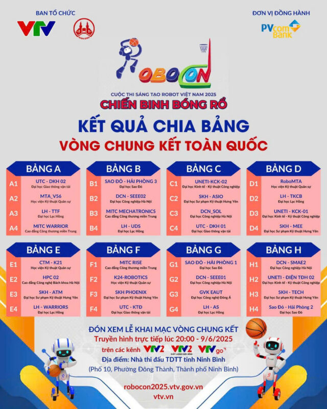 Sáng 07/6, Ban Tổ chức Cuộc thi đã tiến hành cho 32 đội tuyển lọt vào vòng chung kết bốc thăm chia bảng. Kết quả, đội MTA-V56 do Viện Cơ khí động lực chủ trì nằm ở bảng A, sẽ thi đấu trận khai mạc vòng chung kết vào tối 08/6; đội RoboMTA do Tổ Tư vấn kỹ thuật chủ trì nằm ở bảng D, thi đấu vào tối 09/6; đội CTM-K21 do Khoa Cơ khí chủ trì nằm ở bảng E và đội K24-Robotics do Khoa Hàng không vũ trụ chủ trì nằm ở bảng F, cùng thi đấu vào tối 10/6.