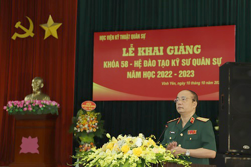 Phát biểu tại Lễ Khai giảng, Trung tướng Nguyễn Công Định đã nhấn mạnh năm học 2022 – 2023 là năm đầu tiên Học viện triển khai đào tạo giai đoạn 1 hệ kỹ sư quân sự theo chủ trương của Quân ủy Trung ương và Bộ Quốc phòng. Để thực hiện tốt nhiệm vụ này đòi hỏi các cơ quan chức năng, khoa giáo viên và đơn vị quản lí học viên phải tập trung cao nhất nguồn lực, khắc phục khó khăn, phối hợp chặt chẽ trong thực hiện nhiệm vụ; các đồng chí cán bộ, giảng viên phát huy truyền thống Học viện KTQS Anh hùng, đem hết tài năng, trí tuệ, tâm huyết truyền thụ cho các em học viên kiến thức, kỹ năng cũng như ý chí quyết tâm của một người lính xung kích trên mặt trận khoa học – kỹ thuật. Đồng chí Giám đốc Học viện mong muốn các em học viên Khóa 58 đoàn kết, xây dựng động cơ học tập đúng đắn, không ngừng tu dưỡng, rèn luyện, trau dồi tri thức, đạo đức để trở thành người cán bộ kỹ thuật “vừa hồng, vừa chuyên”.