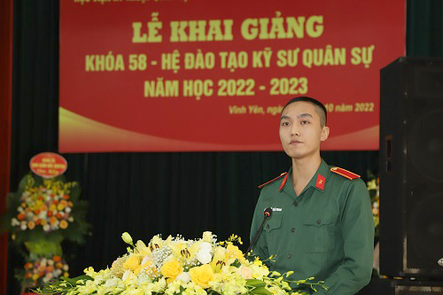 Đại diện cho 509 tân học viên Khóa 58, đồng chí Nguyễn Hải Phong – học viên Đại đội 3/Tiểu đoàn 5 đã phát biểu cảm nghĩ, bày tỏ niềm tự hào khi trúng tuyển và được học tập, rèn luyện tại Học viện KTQS; đồng thời hứa sẽ nỗ lực phấn đấu với một tinh thần nghiêm túc và cầu thị để đạt kết quả cao nhất trong học tập cũng như rèn luyện.