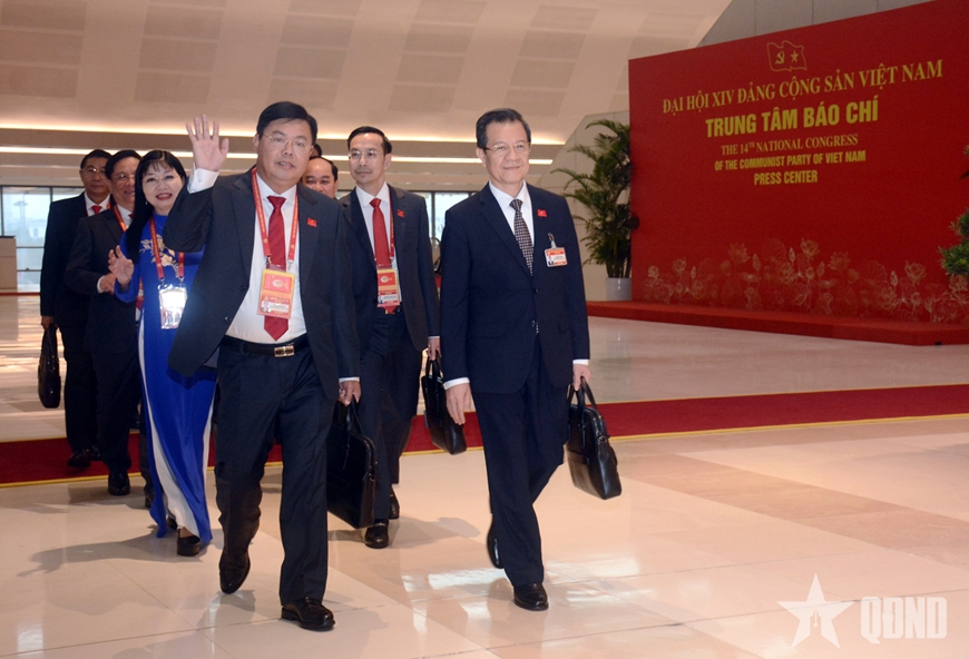 Các đại biểu phấn khởi đến dự phiên khai mạc trọng thể Đại hội XIV của Đảng.