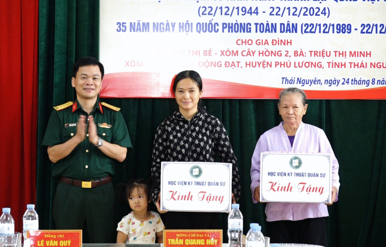 Ngày 24/08/2024, Học viện KTQS phối hợp với huyện Phú Lương, tỉnh Thái Nguyên, Ngân hàng TMCP quân đội MB Thái Nguyên và xã Động Đạt tổ chức Chương trình khánh thành “Nhà Đại đoàn kết” cho 02 gia đình có hoàn cảnh khó khăn của xã Động Đạt, nhân dịp kỷ niệm 80 năm ngày thành lập Quân đội Nhân dân Việt Nam (22/12/1944-22/12/2024); 35 năm ngày Hội Quốc phòng toàn dân (22/12/1989-22/12/2024). Dự Chương trình có Đại tá Trần Quang Huy – Phó Chủ nhiệm Chính trị Học Viện KTQS. Huyện Phú Lương dự Chương trình có đồng chí Lê Văn Quý – Phó bí thư Thường trực Huyện ủy, Chủ tịch HĐND huyện Phú Lương; đồng chí Doãn Thanh Nhân – Ủy viên BTV, Trưởng Ban tổ chức Huyện ủy; Đảng ủy, HĐND, UBND, Ủy ban MTTQ xã Động Đạt; đại diện xóm Khe Nác, xóm Cây Hồng 2 và 02 gia đình được hỗ trợ xây nhà Đại đoàn kết.