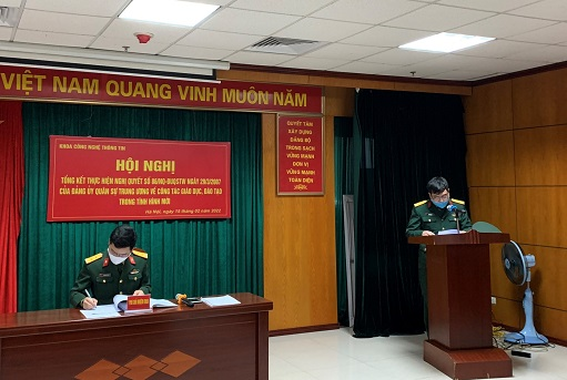 Sáng 15/02/2022, Khoa Công nghệ thông tin (CNTT) đã tổ chức Hội nghị Tổng kết thực hiện Nghị quyết số 86/NQ-ĐUQSTW ngày 29/3/2007 của Đảng ủy Quân sự Trung ương (nay là Quân ủy Trung ương) về công tác giáo dục, đào tạo (GD, ĐT) trong tình hình mới. Trung tá PGS. TS Tạ Minh Thanh – Phó Chủ nhiệm khoa chủ trì Hội nghị.
