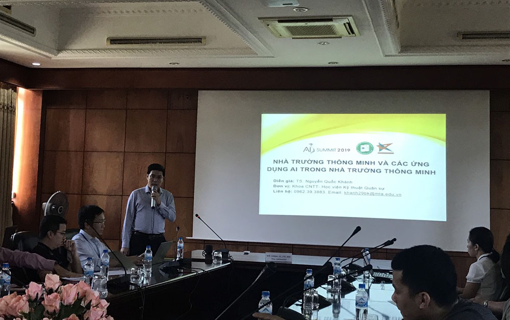 Tại hội thảo Tiềm năng ứng dụng AI trong giáo dục, TS Nguyễn Quốc Khánh – Phó Chủ nhiệm Bộ môn Công nghệ phần mềm/Khoa CNTT cũng có bài thuyết trình với chủ đề “Nhà trường thông minh và ứng dụng AI trong nhà trường thông minh”.