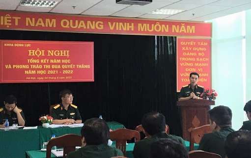 Hội nghị đã được nghe Đại tá TS Võ Văn Trung – Bí thư Đảng ủy, Phó Chủ nhiệm khoa báo cáo kết quả thực hiện nhiệm vụ năm học 2021-2022; Thượng tá PGS. TS Nguyễn Trung Kiên – Phó Bí thư Đảng ủy, Chủ nhiệm Khoa Động lực báo cáo kết quả phong trào thi đua Quyết thắng năm học 2021-2022. Trong năm qua, Đảng ủy, chỉ huy Khoa, cấp ủy chi bộ các bộ môn đã lãnh đạo, chỉ đạo, triển khai có hiệu quả phong trào thi đua Quyết thắng, gắn với đẩy mạnh học tập và làm theo tư tưởng, đạo đức, phong cách Hồ Chí Minh và Nghị quyết Trung ương 4 (khóa XII) về tăng cường xây dựng, chỉnh đốn Đảng; chỉ thị số 855-CT/QUTW ngày 12/8/2019 của Thường vụ QUTW về đẩy mạnh Cuộc vận động Phát huy truyền thống, cống hiến tài năng, xứng danh “Bộ đội Cụ Hồ” thời kỳ mới. Tổng tải giảng dạy, nghiên cứu khoa học của cán bộ, giáo viên của Khoa Động lực là 16.032 giờ chuẩn, đạt 501 giờ chuẩn/giáo viên. Hoàn thành rà soát, điều chỉnh 04 chương trình đào tạo (CTĐT) kỹ sư quân sự dài hạn 5,5 năm; chuẩn bị hồ sơ mở mới ngành Kỹ thuật Cơ khí động lực. Triển khai xây dựng CTĐT kỹ sư quân sự dài hạn CTĐT 5 năm, CTĐT thạc sĩ và tiến sĩ theo quy chế mới; hướng dẫn bảo vệ thành công 03 luận án tiến sĩ, 23 luận văn cao học, 92 đồ án tốt nghiệp; nghiệm thu 04 giáo trình, tài liệu tham khảo. Cán bộ, giáo viên trong Khoa đã chủ trì thực hiện 03 đề tài cấp quốc gia (trong đó có 02 đề tài Nafosted), 01 đề tài cấp bộ, 05 đề tài cấp ngành và 07 đề tài cấp Học viện; thực hiện 10 hợp đồng dịch vụ khoa học công nghệ. Tích cực công bố khoa học quốc tế và trong nước với kết quả 63 công bố khoa học được đăng trên các tạp chí, hội nghị khoa học, trong đó có 13 bài báo thuộc danh mục ISI, SCOPUS. Năm học 2021-2022, Khoa có 01 giảng viên đạt giải Nhì, Giải thưởng Tuổi trẻ sáng tạo trong Quân đội năm 2022; có 01 sản phẩm đạt giải A tại Hội thi sáng kiến cải tiến trang thiết bị đào tạo các học viện, trường sĩ quan năm 2021 do Bộ Tổng tham mưu tổ chức; 01 giảng viên đạt giải Bài giảng E-learning xuất sắc tại Hội thi Phương pháp giảng dạy năm 2022; được Cục sở hữu trí tuệ cấp Giải pháp hữu ích cho sản phẩm “Thiết bị làm mát dạng tấm cho động cơ diesel tàu thủy kiểu M500”.