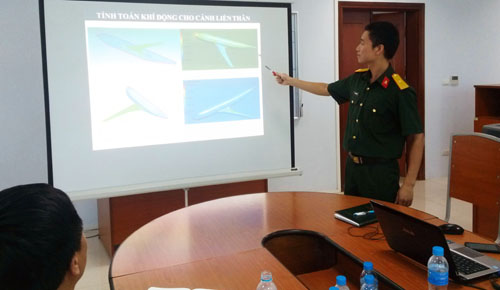 Đồng chí Vũ Thành Trung đã báo cáo đề tài “Nghiên cứu tính toán ảnh hưởng của sự trao đổi nhiệt giữa cánh máy bay và dòng khí có vận tốc dưới âm đến các thông số khí động của cánh”. Thông qua nghiên cứu tấm mỏng, một số biên dạng cánh và cánh thực 3D gắn liền với thân, đề tài đã mô tả cụ thể cơ chế tác động của sự trao đổi nhiệt yếu giữa dòng khí với bề mặt cánh lên các thông số khí động đặc trưng của cánh. Từ các kết quả tính toán được, đã rút ra kết luận: có thể tác động đến lực cản, lực nâng của cánh thông qua việc làm nóng hay làm lạnh bề mặt cánh, từ đó cải thiện chất lượng khí động của thiết bị bay. Điều này có ý nghĩa thực tiễn rất lớn trong ngành hàng không. Đề tài đã hoàn thành vượt mức các yêu cầu đặt ra, được hội đồng nghiệm thu đánh giá đạt loại Xuất sắc.