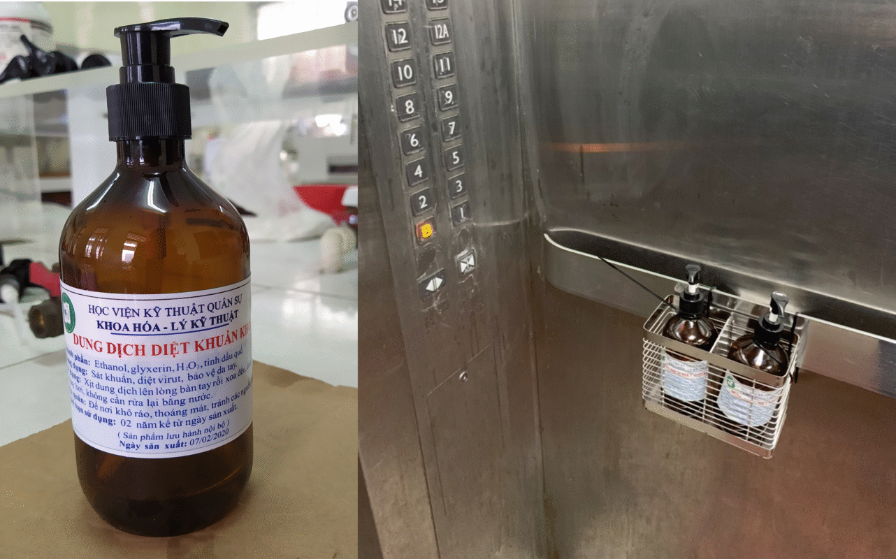 Tận dụng trang thiết bị, cơ sở vật chất sẵn có cùng những kiến thức chuyên môn của mình, tập thể các giáo viên, nhân viên kỹ thuật và học viên của Khoa Hóa – Lý kỹ thuật đã tự tính toán tỷ lệ thích hợp, dùng những thiết bị sẵn có để tiến hành điều chế và đóng chai thành phẩm dung dịch rửa tay sát khuẩn theo công thức mà WHO đưa ra. Thành phần chính của dung dịch diệt khuẩn khô gồm những hóa chất khá phổ biến: Cồn 96%, Glycerin, Ôxy già, nước cất và tinh dầu các loại. Dung dịch diệt khuẩn khô có khả năng khử trùng nhanh chóng mà không cần phải dùng đến nước thông thường