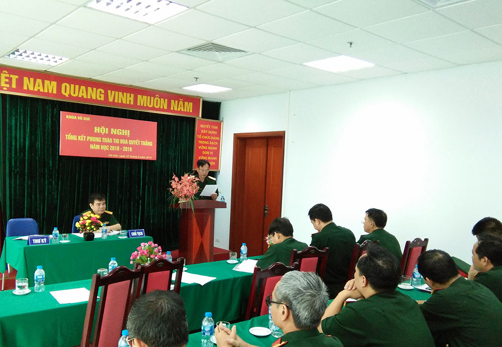 Thực hiện Hướng dẫn Số 2060/HD-CT ngày 12/6/2019 của Phòng Chính trị, sáng 27/8, Khoa Vũ khí đã tổ chức Hội nghị Tổng kết phong trào thi đua Quyết thắng năm học 2018 – 2019. Tới dự và chỉ đạo Hội nghị có Thiếu tướng Nguyễn Lạc Hồng – Ủy viên Thường vụ Đảng ủy, Phó Giám đốc Học viện. Cùng tham dự còn có đại diện Phòng Đào tạo, Phòng Khoa học quân sự, Phòng Sau đại học và đông đủ cán bộ, giáo viên, nhân viên trong toàn Khoa.