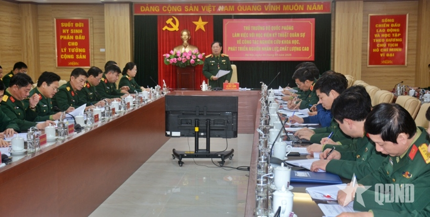 Phát biểu tại buổi làm việc, Thượng tướng Lê Huy Vịnh ghi nhận và đánh giá cao công tác nghiên cứu khoa học và phát triển nguồn nhân lực chất lượng cao của Học viện KTQS. Thời gian tới, đồng chí Thứ trưởng Bộ Quốc phòng đề nghị Học viện tập trung nguồn lực nghiên cứu, làm chủ một số công nghệ lõi, công nghệ nền phục vụ nghiên cứu, sản xuất, phát triển hệ thống vũ khí công nghệ cao; xây dựng, mở mới, triển khai các ngành, chuyên ngành đáp ứng yêu cầu, nhiệm vụ của Quân đội, đào tạo nguồn nhân lực chất lượng cao phục vụ chuyển đổi số, trí tuệ nhân tạo.