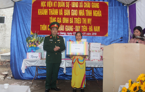 Chiều 03/01, Học viện KTQS phối hợp với Đảng ủy, HĐND, UBND, UBMTTQ xã và nhân dân thôn Chằm, xã Châu Giang, huyện Duy Tiên, tỉnh Hà Nam tổ chức Lễ khánh thành và bàn giao nhà tình nghĩa tặng gia đình bà Triệu Thị Mỵ, là vợ liệt sĩ Phạm Thanh Thủy.