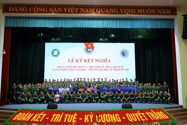 Sáng 01/6/2025, tại hội trường S5, Học viện KTQS, Đoàn cơ sở Tiểu đoàn 2 đã long trọng tổ chức Lễ ký kết nghĩa với Liên chi đoàn Khoa Việt Nam học/Trường ĐH Sư phạm Hà Nội. Tham dự buổi Lễ có Trung tá Trần Xuân Dương – Bí thư Đảng ủy, Chính trị viên Tiểu đoàn; đồng chí Nguyễn Hồng Ánh – Ủy viên BCH Đoàn Trường ĐH Sư phạm Hà Nội; đại diện cơ quan Phòng Chính trị/Học viện KTQS và cán bộ, đoàn viên, thanh niên hai đơn vị.