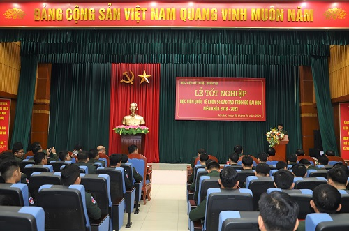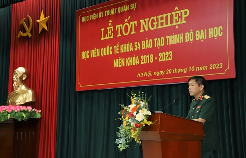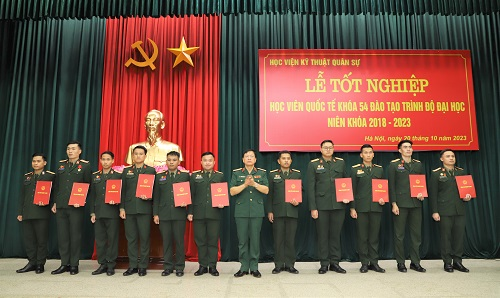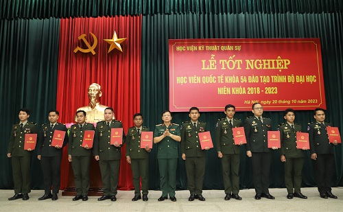 Chiều 20/10/2023, Học viện KTQS đã tổ chức Lễ tốt nghiệp học viên quốc tế Khóa 54 đào tạo trình độ đại học. Thiếu tướng Trần Văn Thưởng – Chính ủy Học viện chủ trì buổi Lễ. Tham dự buổi Lễ có Đại tá Vongxay Inthakham – Trưởng Tùy viên Quốc phòng Lào tại Việt Nam, Đại tá Rem Kann – Trưởng tùy viên Quốc phòng Campuchia tại Việt Nam, đại biểu Cục Nhà trường/BTTM, đại diện chỉ huy các cơ quan, khoa, viện, đơn vị quản lý học viên cùng 41 tân kỹ sư quân sự Lào, Campuchia Khóa 54.