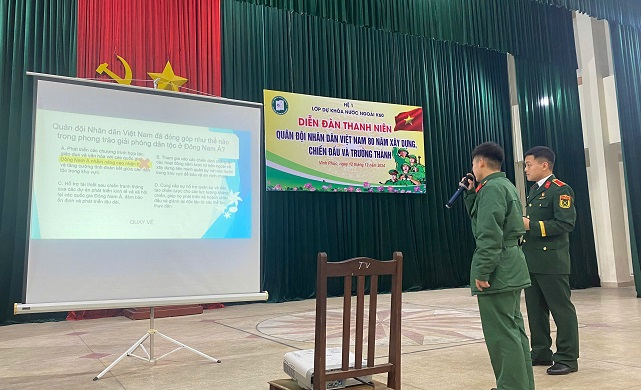 Mở đầu diễn đàn là phần thuyết trình về truyền thống, quá trình phát triển cũng như những thành tựu nổi bật mà Quân đội ta đã đạt được trong suốt 80 năm qua. Với chất giọng truyền cảm, ấm áp của người dẫn chương trình và sự kết hợp hài hòa giữa các hình ảnh chân thực đã làm cho các đoàn viên thanh niên như được sống lại những ngày tháng hào hùng theo tiến trình lịch sử của Quân đội.