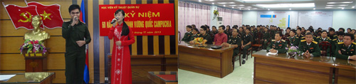 Trong bài diễn văn tại buổi lễ, Đại úy LuybunLong – Trưởng đoàn Học viên Căm-pu-chia nêu bật những giá trị truyền thống lịch sử, tinh thần đoàn kết, hòa bình hòa hợp dân tộc cùng những thành tựu to lớn trên các lĩnh vực kinh tế, văn hóa, chính trị và đối ngoại nhân dân Căm-pu-chia đã đạt được trong 60 năm qua. Là những Học viên đang học tập tại Học Viện KTQS, Bạn cảm ơn sự quan tâm, giúp đỡ của lãnh đạo, Chỉ huy các cấp, các thầy, cô giáo, cán bộ, CNV, học viên trong toàn Học viện đồng thời bày tỏ sự quyết tâm trong học tập, rèn luyện, phấn đấu hoàn thành tốt mọi nhiệm vụ mà đất nước, quân đội Căm-pu-chia giao cho.
