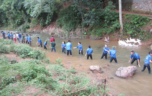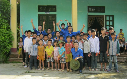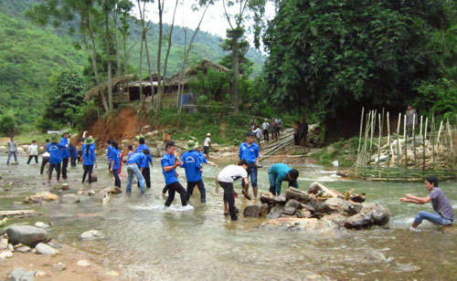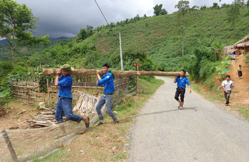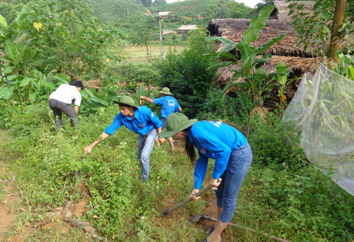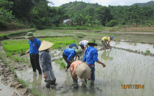 Các sinh viên tình nguyện tham gia giúp đỡ các gia đình chính sách làm vườn, dựng nhà, cấy lúa: