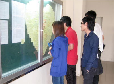 Các sinh viên nội trú Khóa 10 đã thực hiện ý tưởng thu thập 500 tờ giấy nhớ  ghi lại những lời chúc từ cán bộ, học viên, sinh viên ghép thành một trái tim lớn, dán tại bảng tin tiền sảnh S1- khu Xuân Phương để gửi 1.000 lời chúc mừng “Phái đẹp” của khu Xuân Phương nhân ngày 8/3.