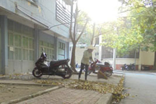 Tôi gặp các chị đều đặn ở con đường đầy lá trên sân trường. “Chị ạ, mấy hôm nay lá rụng nhiều quá, chị quét từ mấy giờ ạ?”, “Từ hơn 5g30 sáng em ạ”. Vậy đó các bạn, từng đống lá nhỏ được vun gọn gàng, để quét hết một đoạn đường, tôi thấy chị dừng lại lấy một chiếc bao to xúc đổ vào, tôi thấy ngạc nhiên vì chị kéo thùng rác bên cạnh nhưng không đổ trực tiếp vào, chị giải thích nhẹ nhàng: “Là thế này em, lá nhiều, lại nhẹ, cồng kềnh nếu đổ ngay vào xe thì được ít mà chỉ cần cơn gió nhẹ lại vương vãi ra xung quanh”, vừa nói chị vừa thoăn thoắt động tác xúc lá đổ vào bao, những chiếc lá chao nghiêng liệng theo chiều gió vẫn rơi, màu vàng của lá lấp lánh dưới tia nắng bình minh của một ngày mới. “Chị thấy công việc thế nào ạ?”. “ Các chị quen rồi em, làm việc gì cũng phải trách nhiệm, nói thật với em có hôm lá rơi vàng rực như một bức tranh không nỡ quét em ạ, đẹp lắm giữa không gian yên tĩnh sớm tinh mơ ấy”, tôi bắt gặp nụ cười tỏa nắng của chị, tôi cũng mỉm cười và nhận ra tâm hồn lãng mạn của con người ta nó không bó hẹp ở bất cứ không gian, hoàn cảnh nào phải không các bạn? Kéo ống tay áo bảo hộ lao động để thấm mồ hôi, chị Nguyễn Thị Nhàn (cùng nhóm các chị mà tôi thường gặp còn có chị Nguyễn Thị Tranh, Nguyễn Thị Thảo…) tâm sự tiếp: “Ngắm một lúc rồi vẫn phải quét em ạ, để đầu giờ học viên, sinh viên lên lớp, mọi người đến làm là đã có con đường sạch đẹp rồi”. Tôi ngước ngắm nhìn những hàng cây gắn bó hàng ngày với các chị, cây cho bóng mát, điểm tô màu xanh những góc sân trường, chính những hàng cây xanh làm mềm mại duyên dáng thêm những ô cửa sổ lớp học được xây ghép bởi những tấm bê tông, và có hàng cây xanh những chiếc ghế đá nơi hò hẹn của tình bạn, tình yêu đôi lứa tuổi học trò, học viên, sinh viên thêm bao kỷ niệm dưới mái trường này, sẽ nhớ mãi không quên…