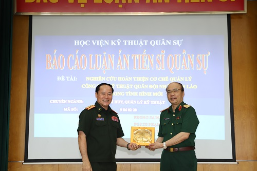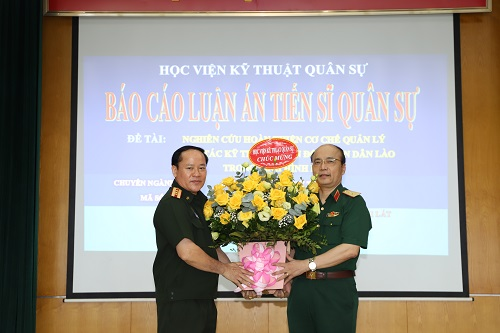 Thay mặt Đảng ủy, Ban Giám đốc Học viện, Trung tướng Nguyễn Công Định phát biểu chúc mừng Fongsamouth Phonhthilat – NCS quốc tế đầu tiên đã bảo vệ thành công LATS cấp Học viện, chúc mừng Bộ Quốc phòng QĐND Lào có thêm một cán bộ có trình độ cao để tham mưu về công tác Chỉ huy, Quản lý kỹ thuật quân sự trong tình hình mới. Đồng chí Giám đốc Học viện nhấn mạnh, Học viện KTQS là một trong những trường trọng điểm của Quân đội, quốc gia, đào tạo nguồn nhân lực chất lượng cao về khoa học kỹ thuật, chỉ huy tham mưu kỹ thuật cho Quân đội Việt Nam cũng như cho bạn bè quốc tế. NCS Fongsamouth là NCS quốc tế đầu tiên bảo vệ thành công LATS tại Học viện. Trong thời gian tới, Học viện hy vọng tiếp tục đào tạo thêm những đồng chí có trình độ tiến sĩ khoa học, kỹ thuật, chỉ huy quản lý kỹ thuật cho QĐND Lào và quân đội các nước trong khu vực.