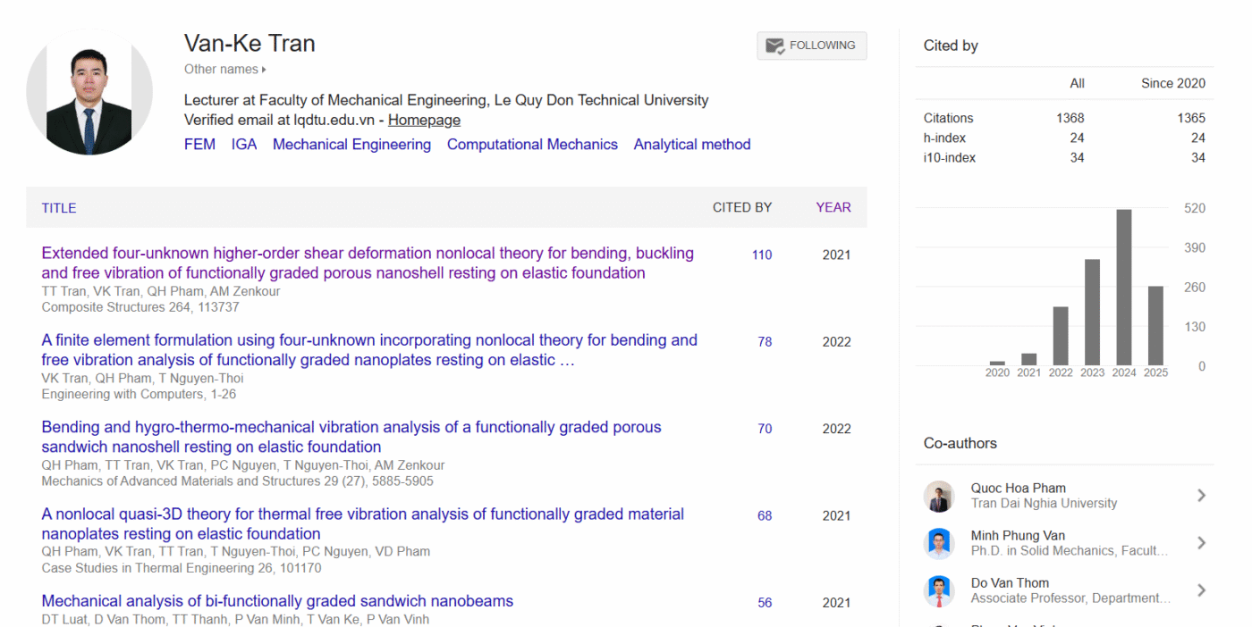 Đặc biệt, vào tháng 3/2025, anh cùng các cộng sự đã công bố công trình “Static and dynamic analysis of doubly-curved functionally graded porous nanoshells integrated with piezoelectric surface layers and flexoelectric effect” trên tạp chí Computers and Structures – một tạp chí SCI (Q1) có chỉ số ảnh hưởng 4.4, phát hành bởi Elsevier.