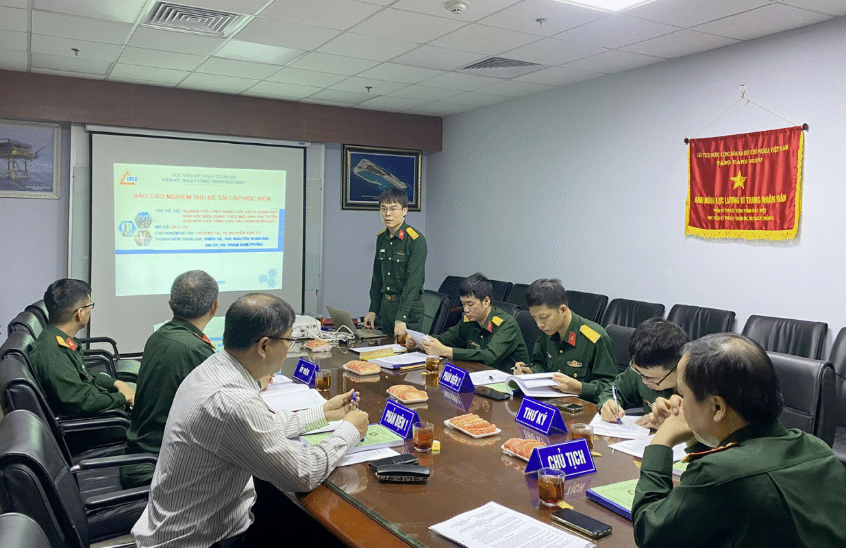 Hội đồng KH&CN nghiệm thu đề tài cấp Học viện gồm: Đại tá PGS. TS Vũ Ngọc Quang – Phó Viện trưởng Viện KTCTĐB, Chủ tịch Hội đồng; Thiếu tá TS Phạm Thanh Bình – Phó Chủ nhiệm Bộ môn XD Nhà & CTCN/Viện KTCTĐB, Thư ký Hội đồng; PGS. TS Nguyễn Hồng Sơn – Bộ môn Kết cấu thép – gỗ/Khoa Xây dựng/Đại học Kiến trúc Hà Nội, Phản biện 1; Trung tá TS Vũ Đình Hương – Bộ môn Cơ sở kỹ thuật công trình/Viện KTCTĐB, Phản biện 2; Thượng tá TS Đào Công Bình – Phó Chủ nhiệm Bộ môn XD Nhà & CTCN/Viện KTCTĐB, Ủy viên.