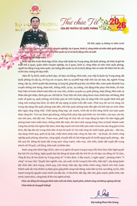 Nhân dịp đón Xuân Bính Ngọ 2026, Đại tướng Phan Văn Giang – Ủy viên Bộ Chính trị, Phó Bí thư Quân ủy Trung ương, Bộ trưởng Bộ Quốc phòng đã có thư gửi sĩ quan, quân nhân chuyên nghiệp, hạ sĩ quan, binh sĩ, công nhân và viên chức quốc phòng, người lao động […]