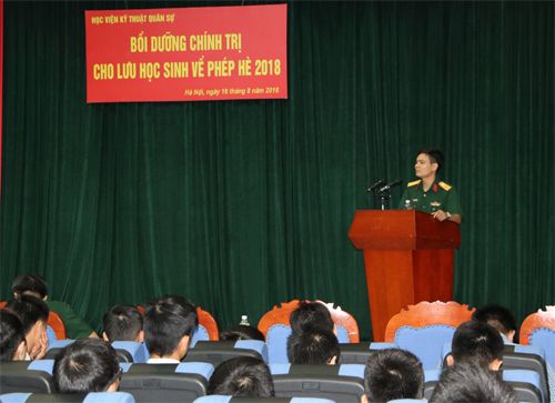 Thực hiện Kế hoạch Số 2048/KH-HTQT ngày 25/6/2018 và Kế hoạch Số 2581/KH-HTQT ngày 13/8/2018 đã được Thủ trưởng Học viện phê duyệt, trong 2 ngày 15 và 16/8, Phòng Hợp tác Quốc tế và Quản lý Lưu học sinh quân sự (HTQT&QLLHSQS) đã phối hợp với các cơ quan, đơn vị trong Học viện tổ chức thành công lớp bồi dưỡng chính trị và hoạt động ngoại khóa cho 106 LHS về phép Hè 2018.