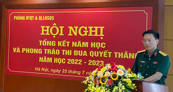 Ngày 25/7/2023, Phòng Hợp tác quốc tế và Quản lý lưu học sinh quân sự (HTQT&QLLHSQS) đã tổ chức Hội nghị Tổng kết năm học và phong trào thi đua Quyết thắng năm học 2022 – 2023. Tới dự và chỉ đạo Hội nghị có Đại tá Trần Xuân Nam – Ủy viên Ban Thường vụ Đảng ủy, Phó Giám đốc Học viện.