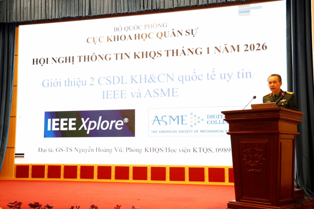 Sáng ngày 22/01/2026, Cục Khoa học Quân sự/BQP tổ chức Hội nghị Thông tin khoa học quân sự (KHQS) toàn quân tháng 1 năm 2026. Đại tá TS Lê Đình Vũ – Phó Cục trưởng Cục KHQS chủ trì Hội nghị tại điểm cầu Trung tâm. Tại Hội nghị, Phòng KHQS đã giới thiệu 02 CSDL KH&CN quốc tế uy tín IEEE và ASME mà Học viện KTQS đã mua quyền khai thác năm 2026.