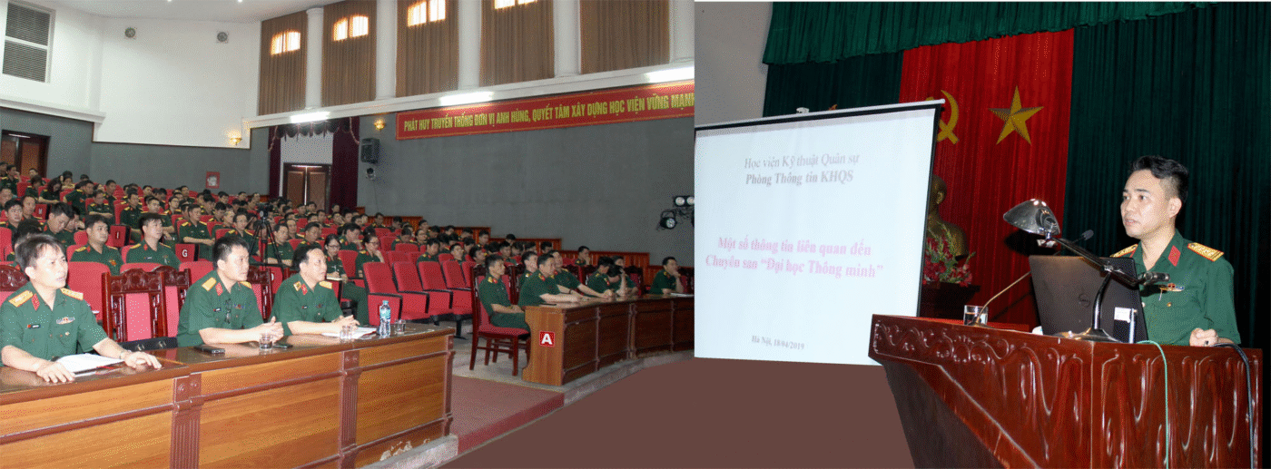 Nhận lời mời của Học viện Hậu cần, ngày 18/4/2019, Phòng Thông tin KHQS/Học viện KTQS đã có buổi thông tin chuyên đề về mô hình “Đại học Thông minh” nhằm chia sẻ những thông tin mới, phục vụ công tác giáo dục – đào tạo, nghiên cứu khoa học, xây dựng nhà trường thông minh tiếp cận cuộc CMCN 4.0 với lãnh đạo, chỉ huy các cơ quan đơn vị và gần 500 cán bộ, giáo viên, học viên SĐH của Học viện Hậu cần.