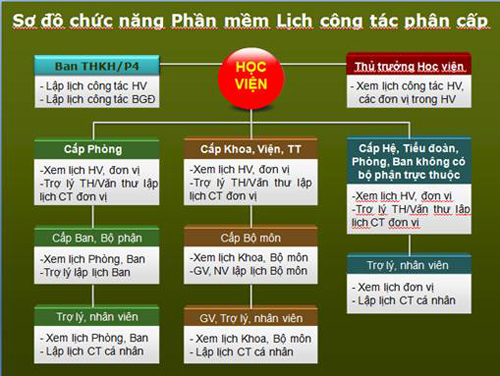 Bộ phần mềm “Lịch công tác phân cấp” và “Nhật ký công việc” cung cấp cho cán bộ quản lý các cấp một công cụ hoàn hảo trong xây dựng và kiểm soát lịch công tác cũng như quá trình triển khai thực hiện nhiệm vụ của các thành viên trong đơn vị mình. Việc triển khai sử dụng bộ phần mềm sẽ mang lại bước đột phá trong cải cách hành chính tại Học viện.