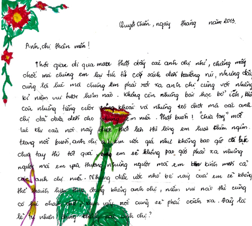 Chia tay rồi vẫn còn những kỷ niệm, em sẽ không bao giờ quên các anh chị những người mà em yêu quý. Em sẽ mãi nhớ những bài giảng, kiến thức mà các anh, chị đã dạy chúng em. Em sẽ nhớ những hình ảnh vui, buồn không ngại khó khăn của các anh chị và em sẽ mãi nhớ chị Huyền Trang, chị đã luôn giải và giảng cho chúng em những bài toán khó. Em sẽ nhớ những kỷ niệm về anh chị tới lúc trưởng thành. Em cảm ơn, em cảm ơn các anh chị đã đi đến Quyết Chiến quê em – một vùng quê nghèo, kinh tế không phát triển để giúp đỡ những người dân ở đây và chúng em. Em cảm ơn các anh chị đã dạy cho chúng em những bài học bổ ích và thú vị, em cảm ơn, em cảm ơn tất cả những điều mà các anh chị đã làm cho Quyết Chiến quê em. Em hy vọng sau khi rời Quyết Chiến này thì các anh chị sẽ lại đến một vùng quê nào đó để giúp đỡ những người dân và các bạn học sinh ở đấy. Em cũng mong đoàn “Thanh niên tình nguyện” của các anh chị sẽ luôn vững vàng để đi làm nhiều việc tốt hơn nữa cho những người dân khắp đất nước Việt Nam của chúng ta nhé. Tuy thư chưa dài nhưng tình cảm vẫn là hơn hết đúng không các anh chị. Em đã dành hết tình cảm của em tới các anh chị vào bức thư này rồi và em sẽ mong một ngày nào đó các anh chị sẽ lại trở về thăm vùng quê nghèo Quyết Chiến quê em nhé!
