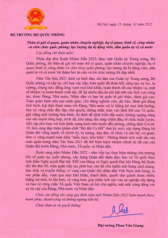 Nhân dịp đón Xuân Nhâm Dần 2022, Đại tướng Phan Văn Giang – Ủy viên Bộ Chính trị, Phó bí thư Quân ủy Trung ương, Bộ trưởng Bộ Quốc phòng đã gửi thư chúc Tết sĩ quan, quân nhân chuyên nghiệp, hạ sĩ quan, binh sĩ, công nhân và viên chức quốc phòng; lực lượng dự bị động viên, dân quân tự vệ cả nước. Chúng tôi trân trọng giới thiệu toàn văn thư chúc Tết của Bộ trưởng Bộ Quốc phòng.