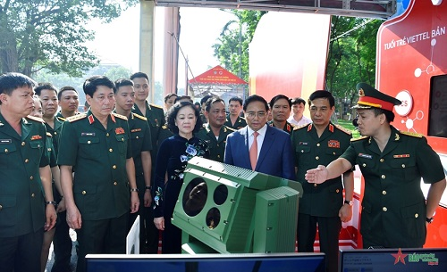 Thủ tướng Phạm Minh Chính và các đại biểu tham quan khu trưng bày sản phẩm tuổi trẻ sáng tạo trong Quân đội