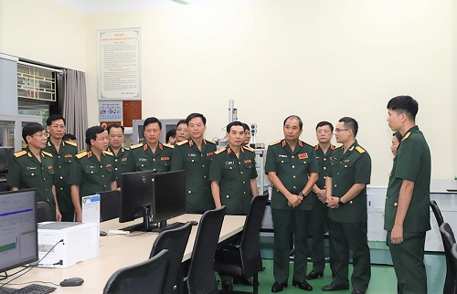 Thượng tướng Phùng Sĩ Tấn và các đại biểu thăm quan phòng thí nghiệm của Học viện KTQS