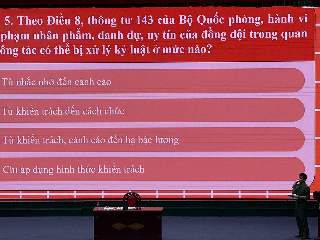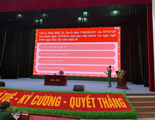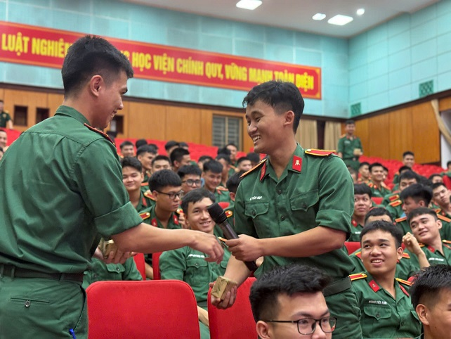 Đặc biệt, phần giao lưu hỏi – đáp với nhân viên, học viên, chiến sĩ đã tạo nên điểm nhấn nổi bật khi nhiều câu hỏi thực tế được đặt ra xoay quanh Thông tư 143/2023/TT-BQP của Bộ Quốc phòng và Quyết định 1700/QĐ-HV của Học viện KTQS. Những câu hỏi sâu sắc và phần giải đáp thẳng thắn, cụ thể đã giúp đông đảo cán bộ, học viên, nhân viên, chiến sĩ hiểu rõ hơn quyền dân chủ của mình, từ đó nâng cao ý thức trách nhiệm cá nhân trong thực hiện nhiệm vụ.