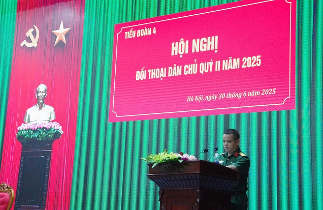 Thực hiện kế hoạch công tác Đảng, công tác chính trị, tối 30/6/2025, Tiểu đoàn 4 đã tổ chức Hội nghị đối thoại dân chủ quý II năm 2025 nhằm đánh giá kết quả thực hiện Quy chế dân chủ ở cơ sở và tiến hành đối thoại trực tiếp giữa cấp ủy, chỉ huy với cán bộ, nhân viên, học viên, chiến sĩ toàn Tiểu đoàn.