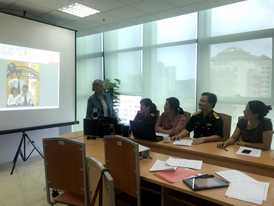 Với kinh nghiệm nhiều năm giảng dạy học viên, sinh viên nước ngoài đến học tập tại Nga, các chuyên gia đã có nhiều chia sẻ thú vị và ý nghĩa về giáo trình, nội dung giảng dạy tiếng Nga. Đặc biệt, tại buổi làm việc, hai chuyên gia Nga đã giới thiệu đến Bộ môn các giáo trình và trang học tiếng Nga trực tuyến pushkininstitute.ru mà các chuyên gia đang sử dụng trong công tác giảng dạy của họ.