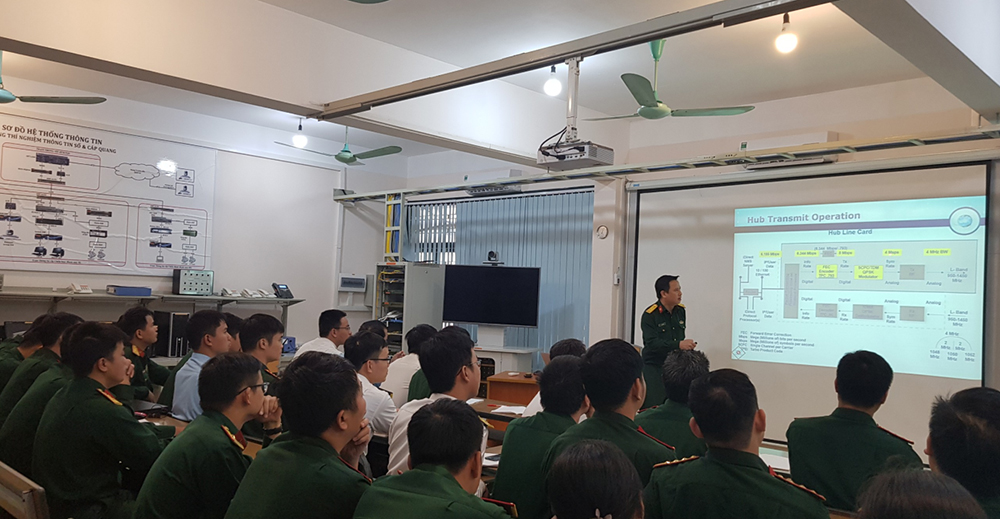 Thực hiện Kết luận Số 2305/TB-ĐT tại Hội nghị trao đổi hợp tác giữa Học viện KTQS và Bộ Tư lệnh Thông tin Liên lạc (TTLL), ngày 31/10/2019, Đại tá Hồ Xuân Hổ – Phó Giám đốc Trung tâm Kỹ thuật Thông tin Công nghệ cao/Binh chủng TTLL đã có buổi giới thiệu chuyên đề “Hệ thống thông tin vệ tinh quân sự” cho học viên cao học Lớp Kỹ thuật Điện tử K30. Tham dự buổi giới thiệu chuyên đề còn có Thượng tá Phạm Xuân Nghĩa – Phó Chủ nhiệm, Bí thư Đảng uỷ Khoa Vô tuyến Điện tử cùng toàn bộ giáo viên, nhân viên kỹ thuật Bộ môn Thông tin.