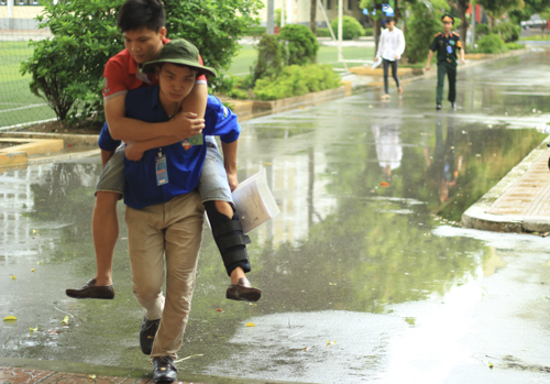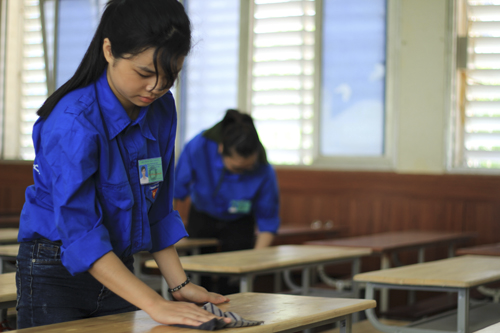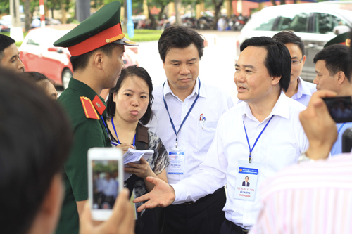 Bộ Trưởng Bộ Giáo dục và Đào tạo Phùng Xuân Nhạ hỏi thăm động viên lực lượng sinh viên tình nguyện đang hỗ trợ tiếp sức mùa thi tại Hội đồng thi Học viện KTQS